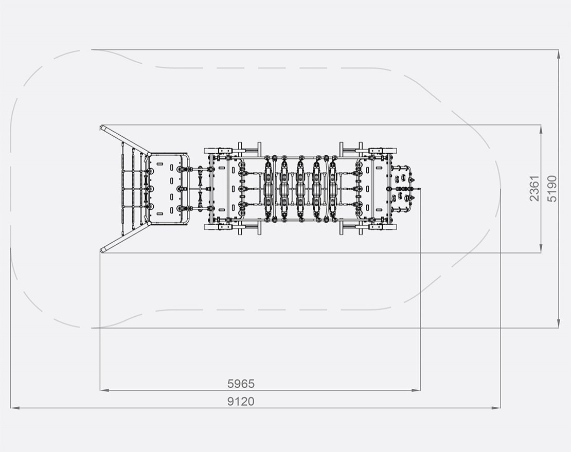 Состоит из металлического каркаса, опорных стоек, канатной сетки и пластиковых уступов. Все крепежные элементы закрыты заглушками.