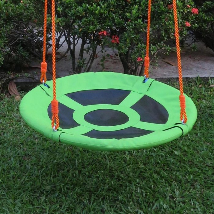 В комплекте: верёвочные качели, качели-качалки для двоих, качели-гнездо, горка и мини-батут.