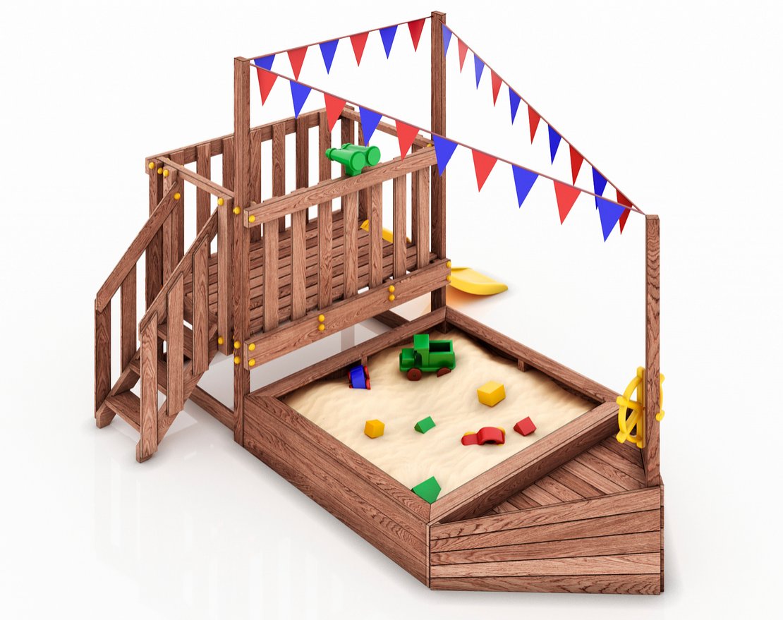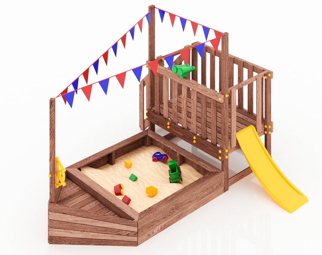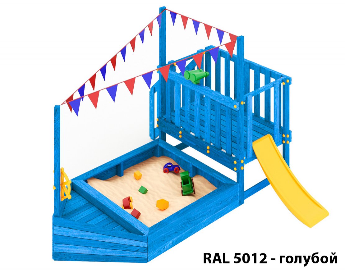 Детская песочница-кораблик и капитанский мостик с горкой с высоты 600 мм с флажками.