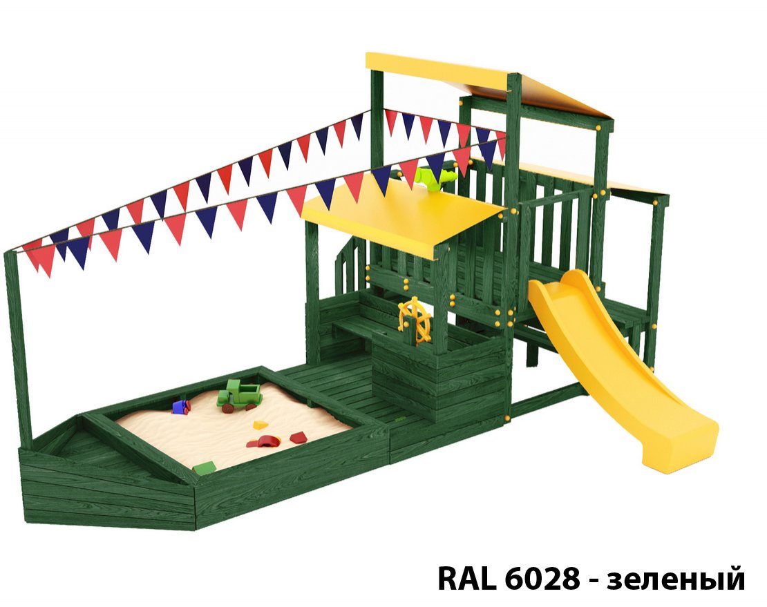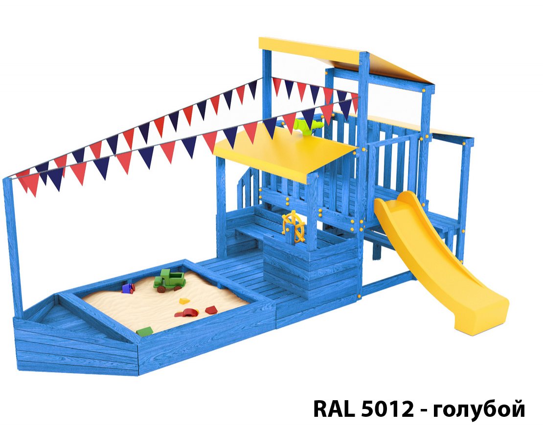 Детская песочница-кораблик, включающая в себя штурманскую рубку и капитанский мостик с горкой с высоты 900 мм с флажками.