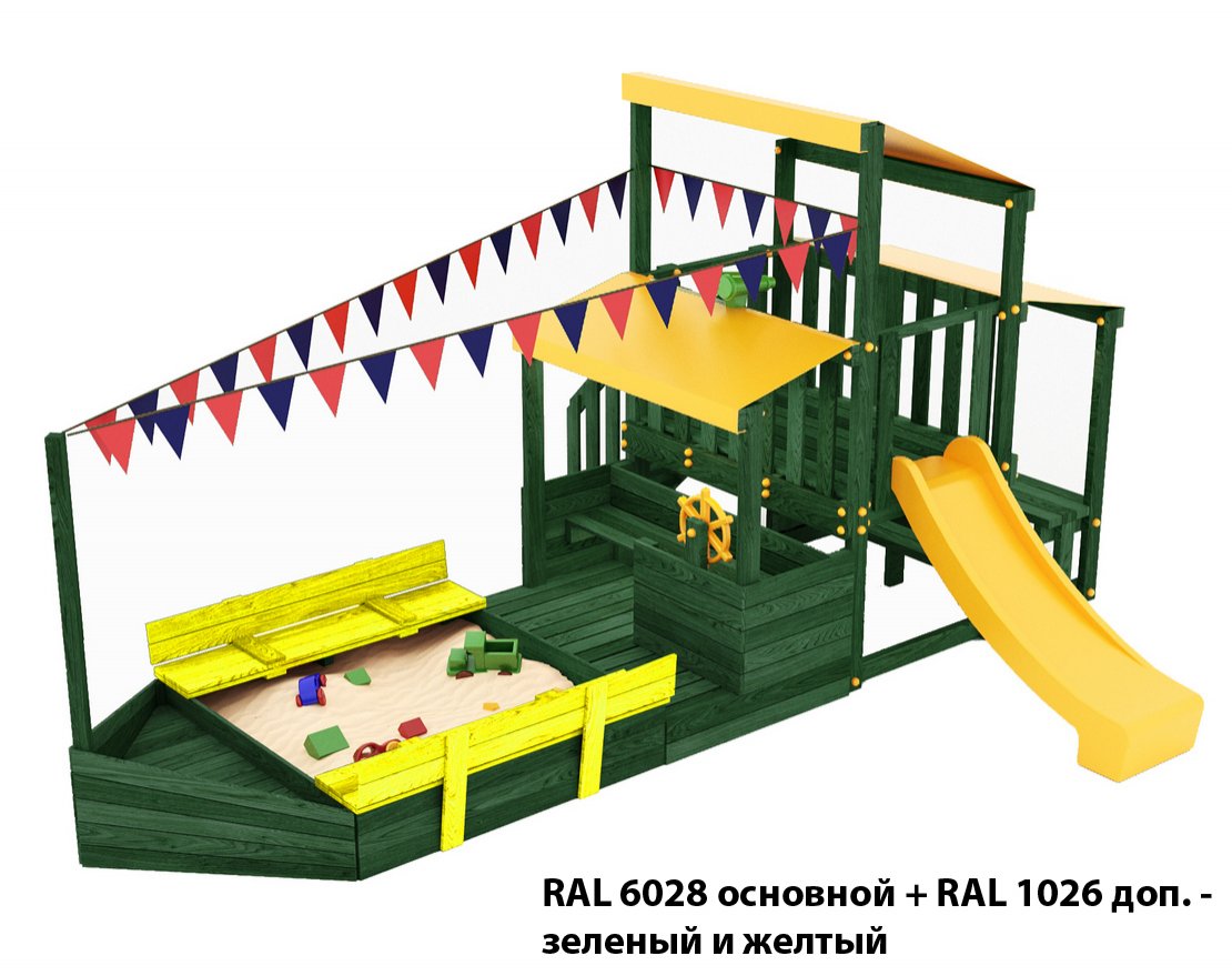 Детская песочница с крышкой-лавочкой и кораблик, включающий в себя штурманскую рубку и капитанский мостик с горкой с высоты 900 мм с флажками.