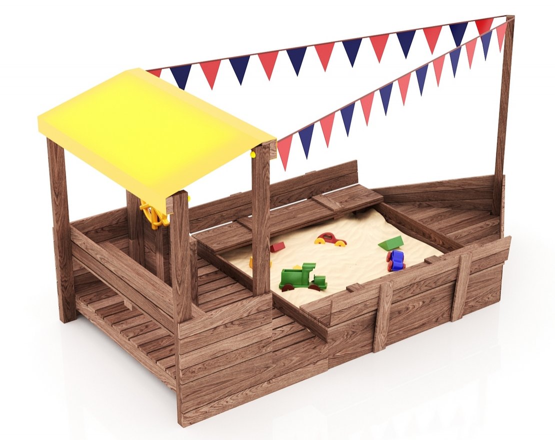 В рабочем разложенном состоянии по бокам песочницы расположены удобные лавочки. После завершения игры песочницу можно легко сложить, превратив боковые лавки в крышу песочницы.