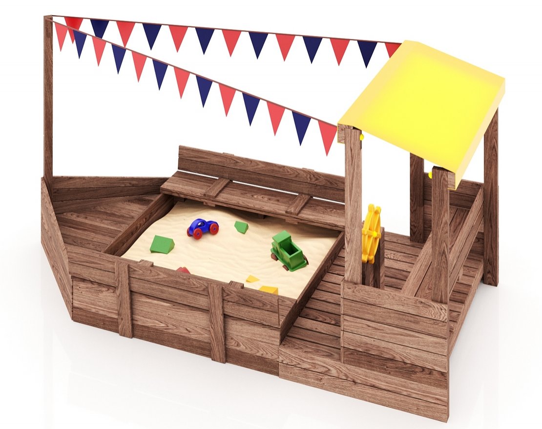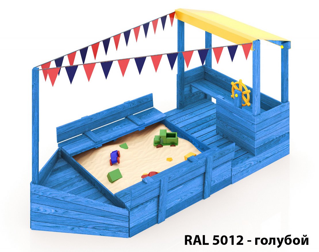 Детская песочница-кораблик и штурманская рубка со штурвалом.